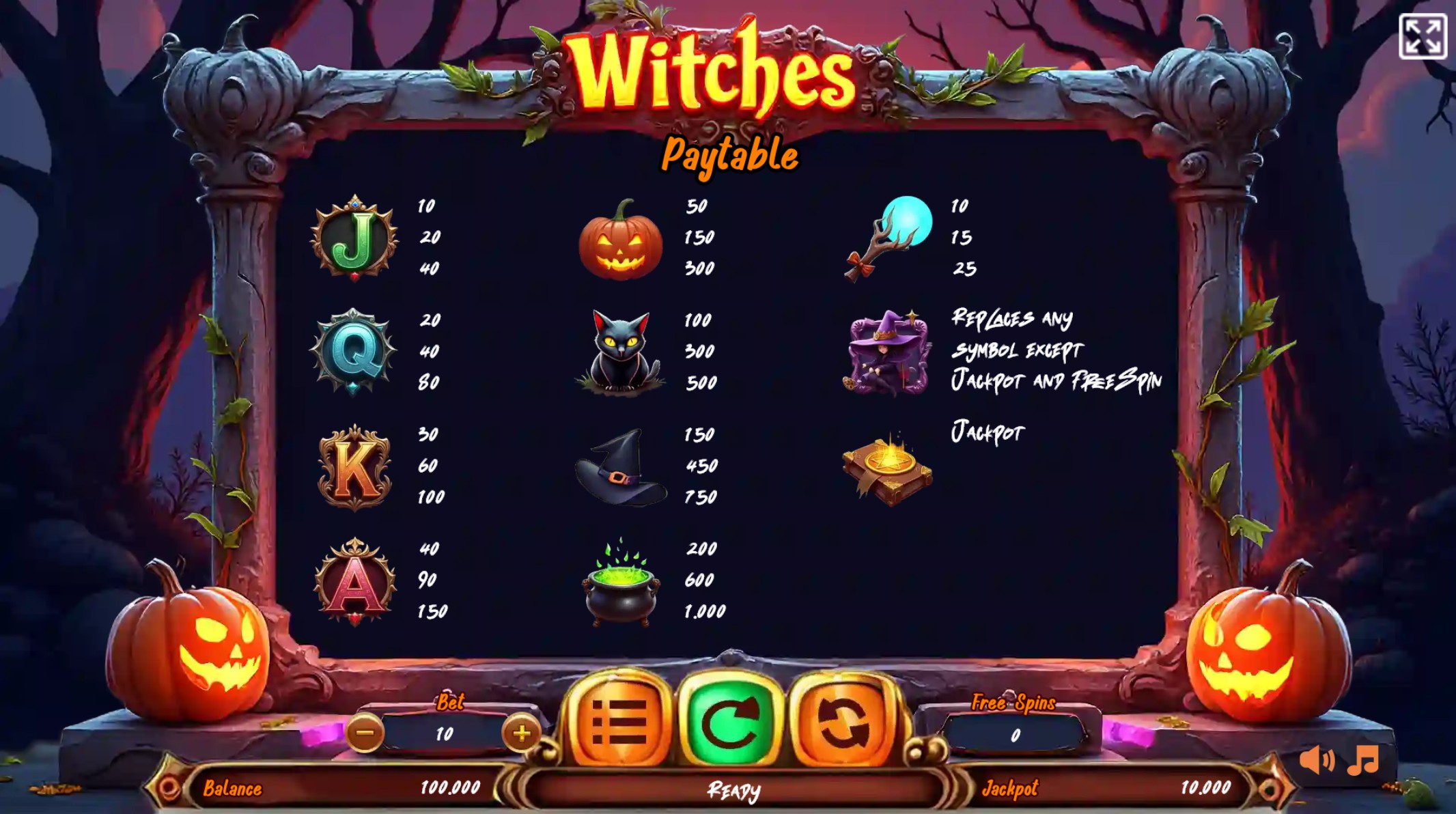 Each symbol in Witches helps create the feel of a soft and magical world. The pumpkin adds warmth, the black cat brings humor, and the cauldron glows with gentle color. The spellbook and witch’s hat carry small hints of mystery without ever adding tension. All symbols serve the purpose of shaping a calm and pleasant fantasy. They appear in different combinations that make the world feel alive and varied. Nothing inside the game pushes players to rush or chase outcomes. The symbols work together to form a welcoming experience that invites players to return whenever they want to enjoy a moment of playful imagination.